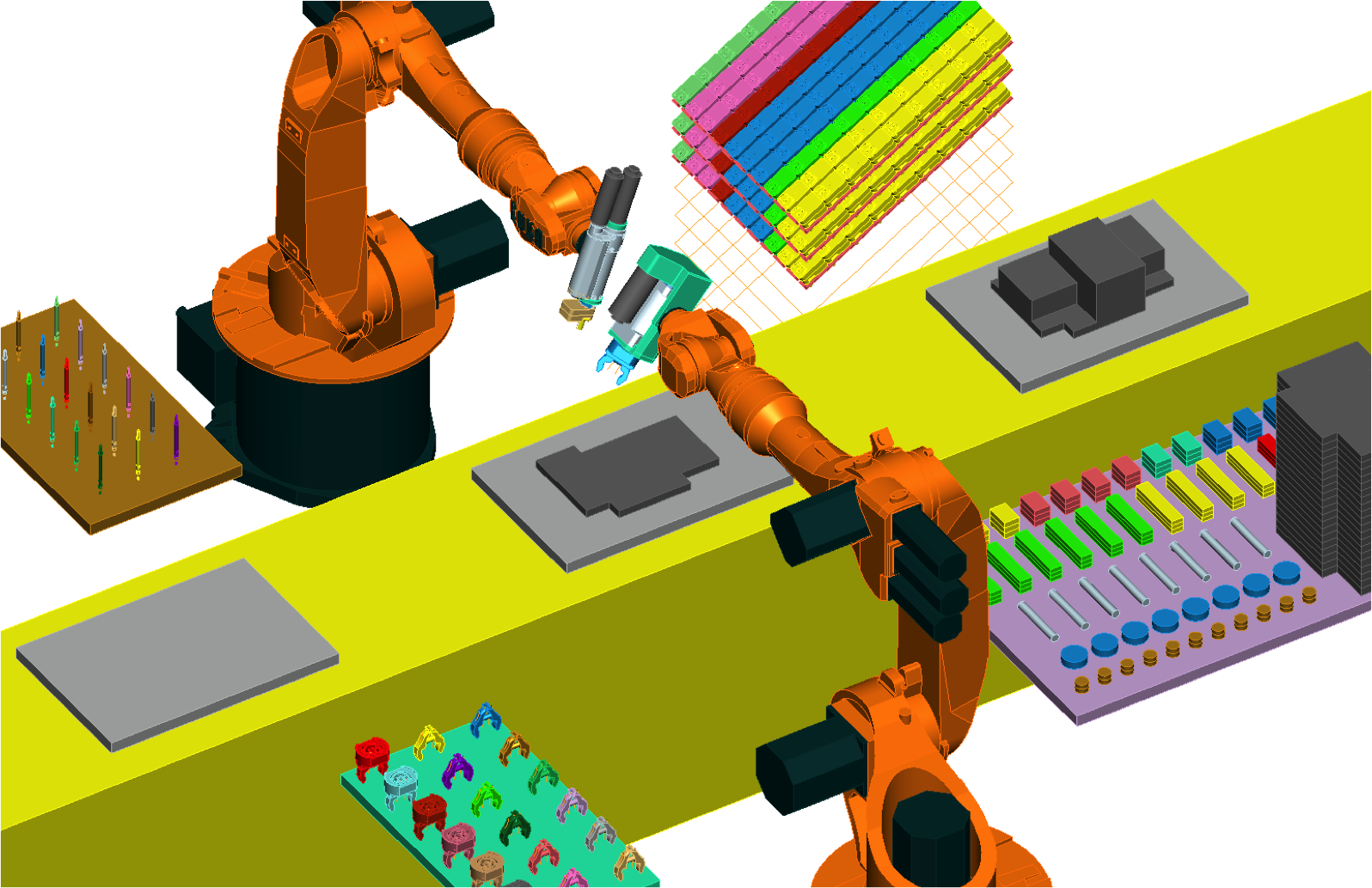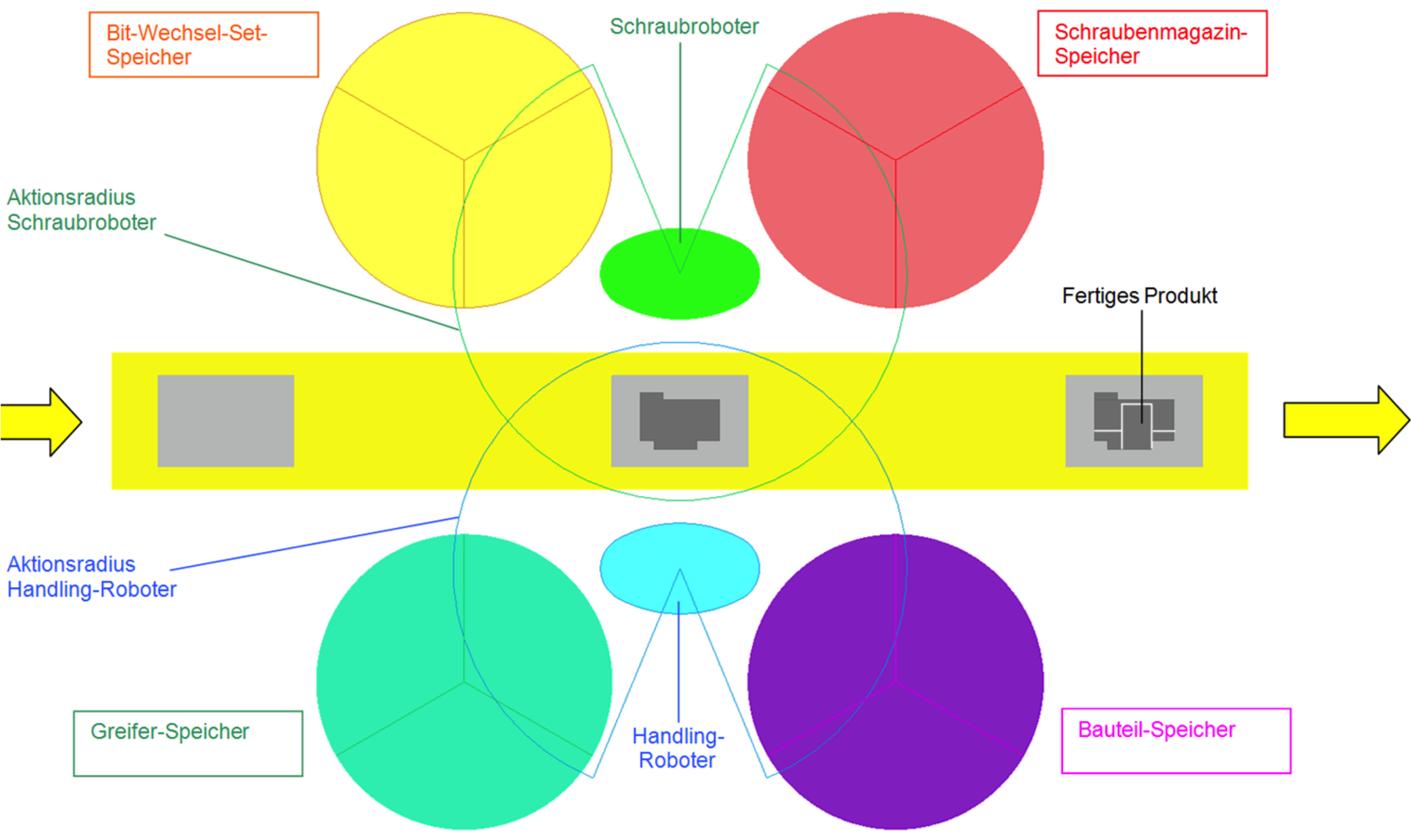 Anforderung: Stark unterschiedliche Montageprozesse auf einer einzigen Montagezelle ermöglichen, indem diese sich selbsttätig konfiguriert. Die Einsatzgrenzen sollen möglichst nur in der Größen- bzw. Gewichtskategorie der Bauteile liegen -und nicht in der Montageaufgabe an sich. D.h. mit einem entsprechend skaliertem Sortiment solcher hochflexiblen Montagezellen ließe sich nahezu alles montieren; - so der Leitgedanke hinter diesem Konzept. (Anmerkung: Wir reden hier nicht von Großserien, wo bewährte Optimierungsprozesse gute Ergebnisse liefern.)